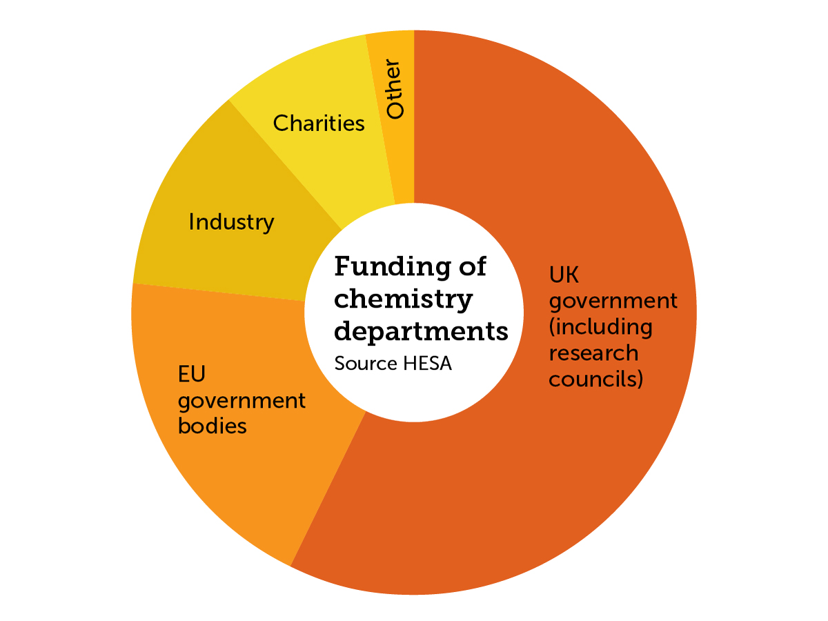 To answer this question it’s best to start by looking at where things were prior to the Spending Review and working forward. The Higher Education Statistics Agency helpfully tracks university finances fairly well and from the chart, you can see that 55% of chemistry departmental funding comes from the UK Government, 51% of which comes from the research councils.