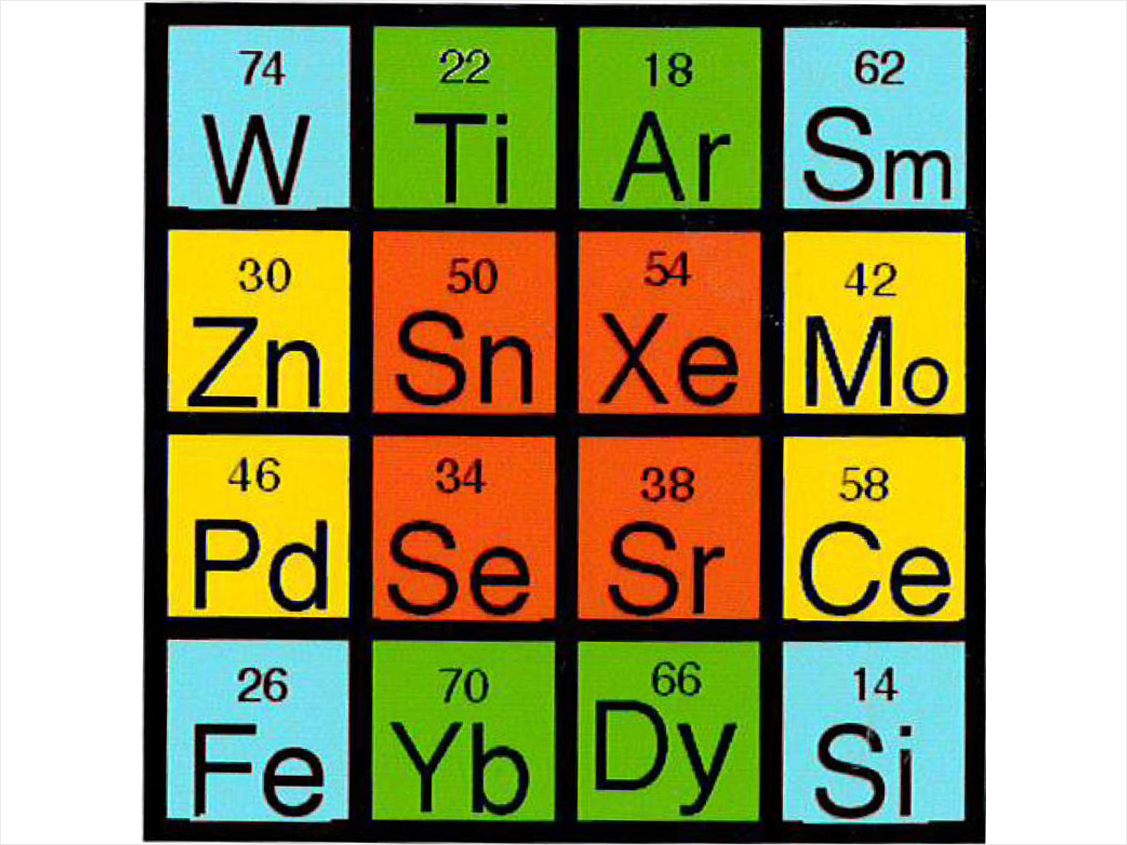 This defines a set of numbers and thereby, using their corresponding atomic numbers, we can define a selection of 16 elements for the year 2017. The array is a 4x4 grid and not only do the rows, columns and major diagonals sum to 176 but so too do the colour-defined corners, mid sides and centre.