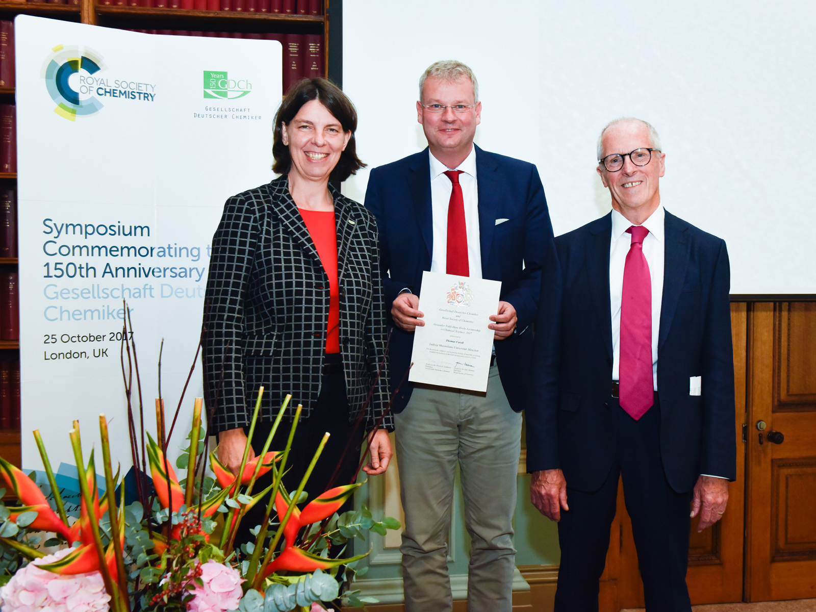 Professor Thomas Carell (centre) with GDCH and Royal Society of Chemistry presidents Thisbe Lindhorst (left) and John Holman (right) Picture: © Royal Society of Chemistry