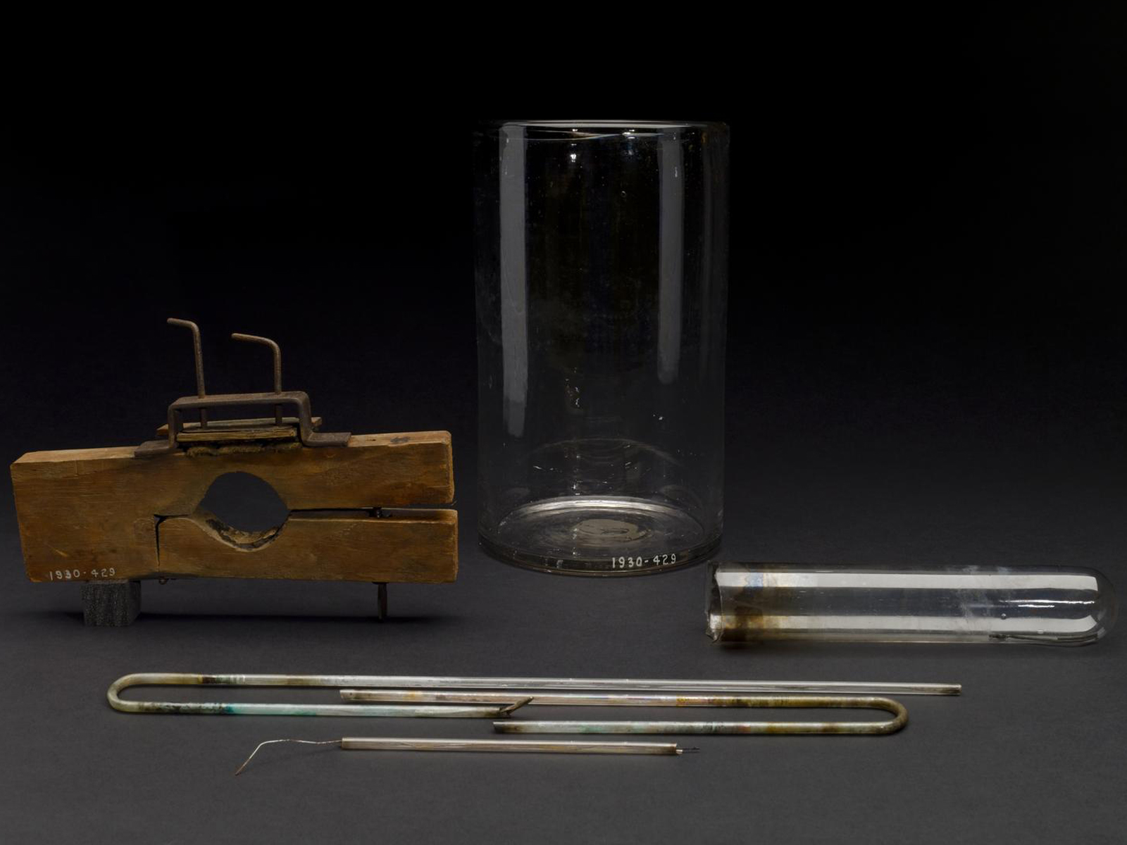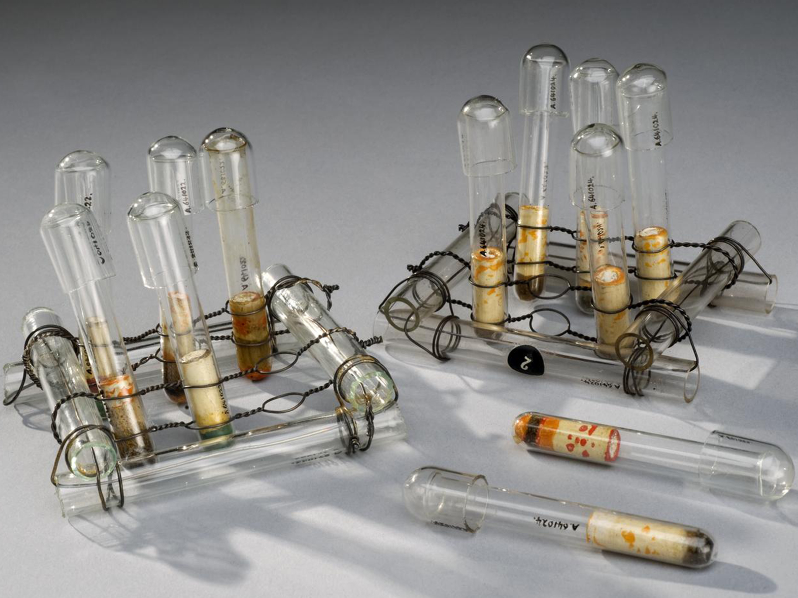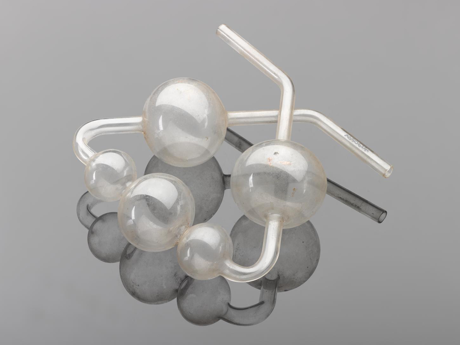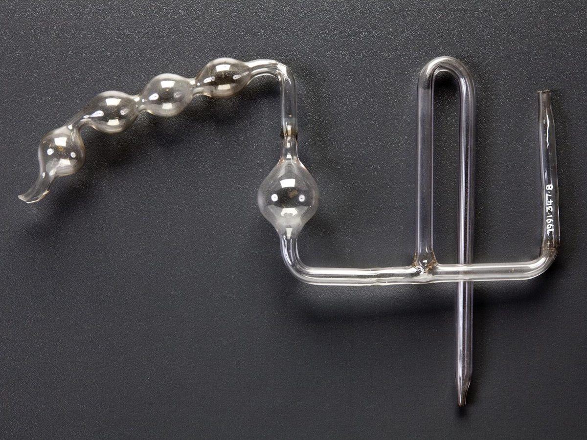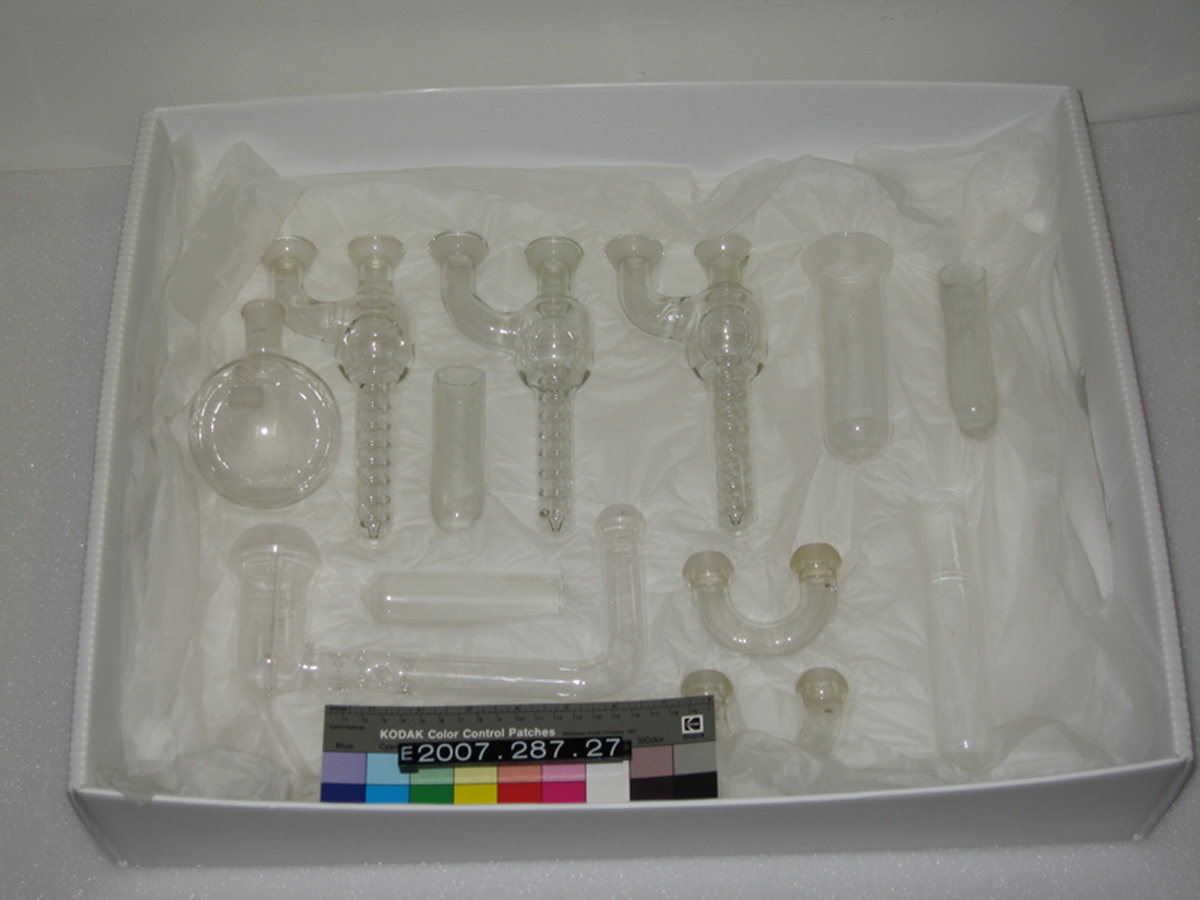 This collection of 12 pieces of glassware made by Quickfit and Quartz Limited will be recognizable to many chemists. The Science Museum collects the everyday life of chemistry, as well as artefacts from the life and work of famous scientists and key experiments. In this photograph you can see the temporary number given to these objects when they arrived at the museum.