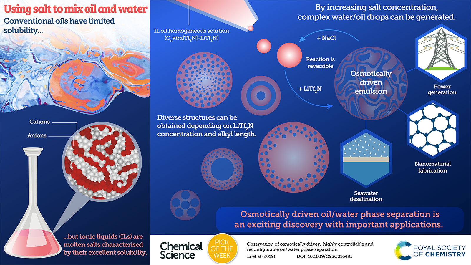 The researchers’ breakthrough was possible by using inorganic salts to draw water into oil from surrounding ionic liquids by generating an osmotic pressure – just like in the salad dressing. They found that one mixture in particular – organic salt LiTf2N and ionic liquid 1-alkyl-3-vinylimidazolium bis(trifluoromethanesulfonyl)imide – showed unique properties.