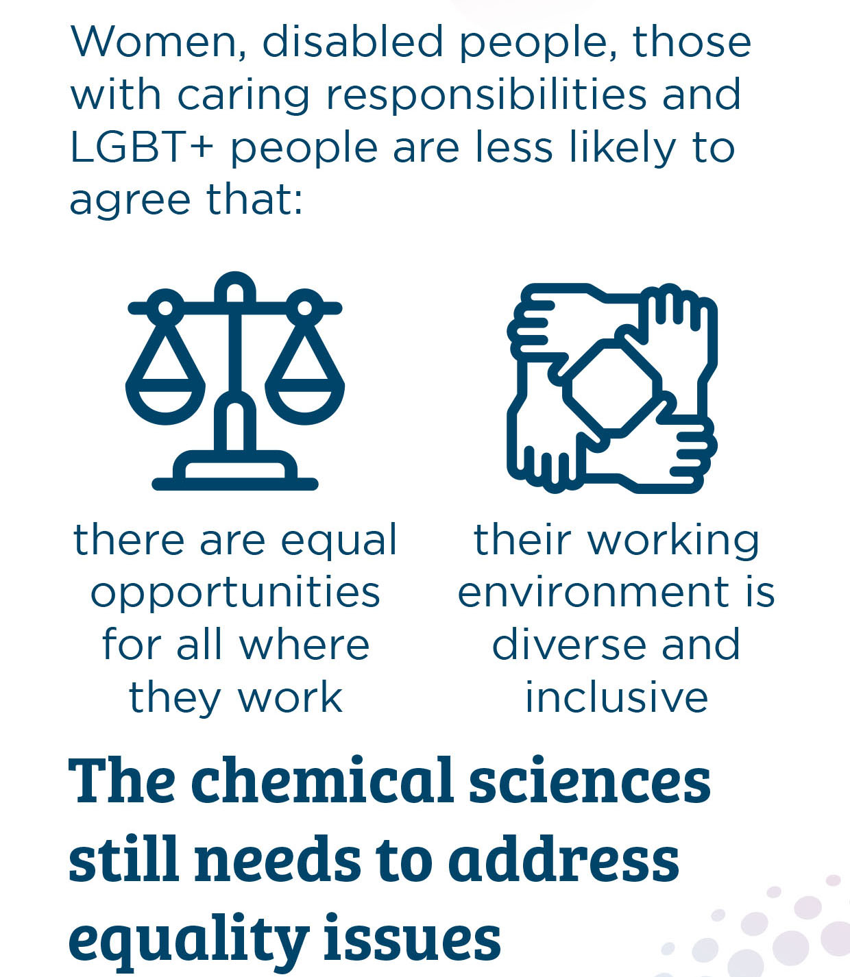 For the chemical sciences to thrive and overcome new challenges it must attract, develop and retain a diverse range of people. Women, disabled people, those with caring responsibilities, and LGBT+ people continue to experience discrimination and bias when it comes to pay, skills development and achieving high levels of responsibility. We're working hard to support our community and highlight examples in the report. The Pay and Reward data will feed into our evidence-driven approach to drive action on inclusive access and progression within the chemical sciences.