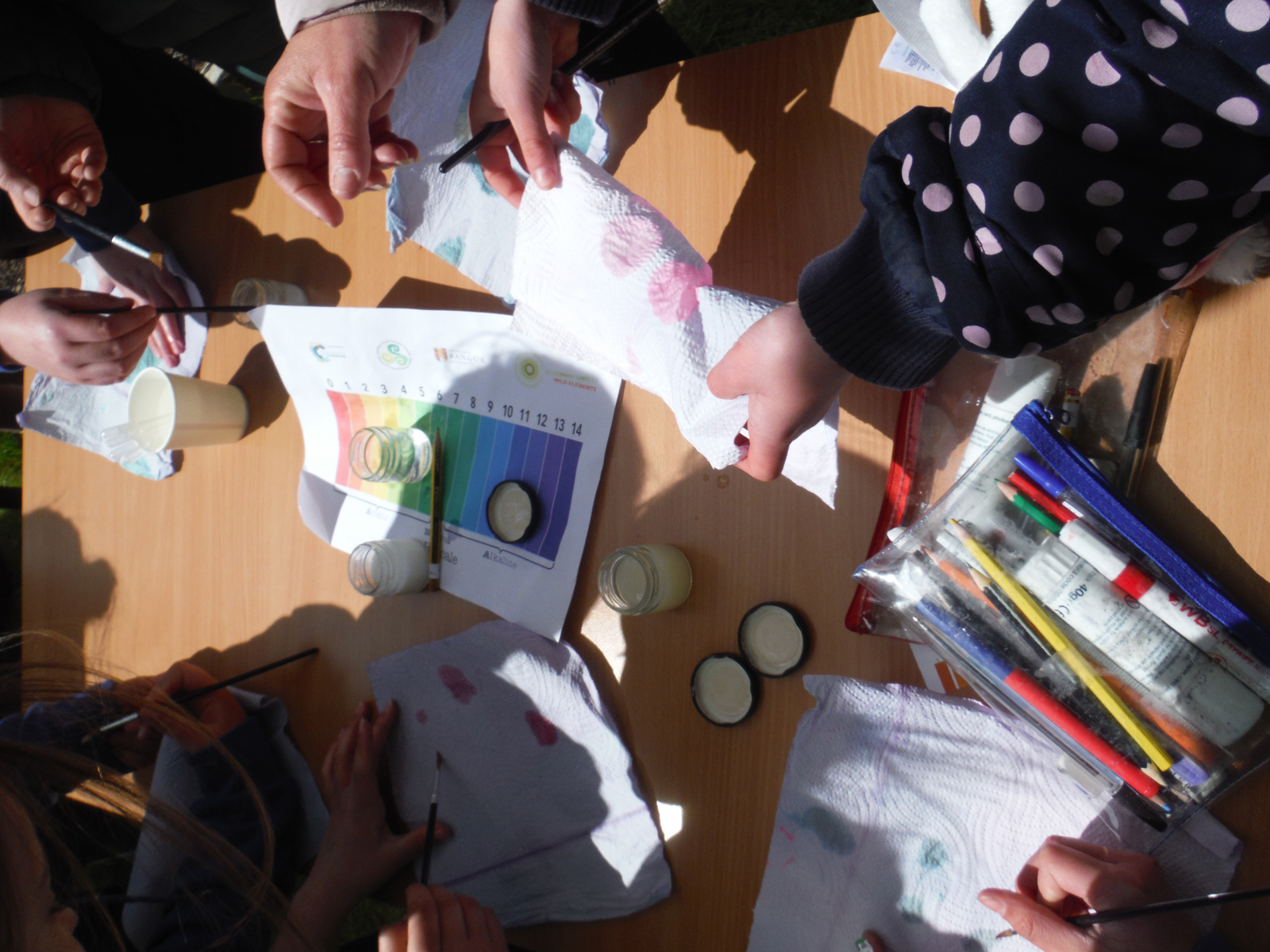 The day included a variety of teaching and learning techniques, beginning with an introduction to the site and subject matter. Wild Elements staff provided, lead and supported hands-on outdoor activities/ experiments demonstrating the use of everyday items, products and groceries in the home e.g. cabbage, onions and felt pens to conduct an experiment (acid & alkaline, chromatography and light spectrum).