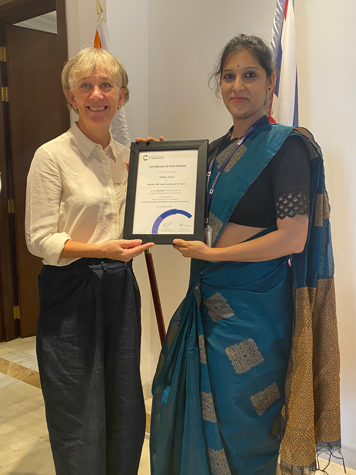 UK Government Chief Scientific Adviser, Professor Dame Angela McLean recently met Shilpa Sunil, of North Hill International School in Bengaluru – the 40,000th teacher trained through workshops run as part of Royal Society of Chemistry’s Yusuf Hamied Inspirational Science Programme.