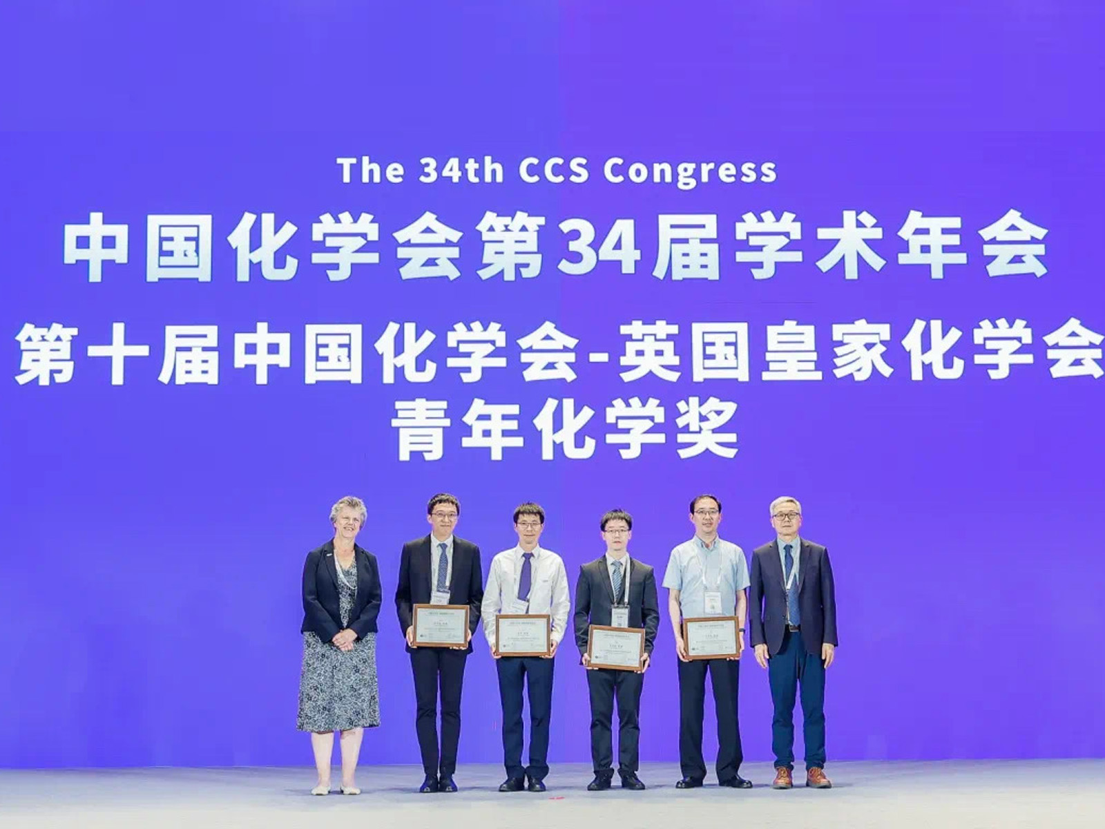 Prof Gill Reid (left) and Prof Xue-Ming Yang, Vice President of CCS (right), presented prizes to the winners of the 10th CCS-RSC Young Chemists Award: (l-r) Wenjing Hong, Xiamen University, Hua Lv, Peking University, Dagang Yu, Sichuan University, Zhiwei Zuo, Shanghai Institute of Organic Chemistry Picture: © Royal Society of Chemistry