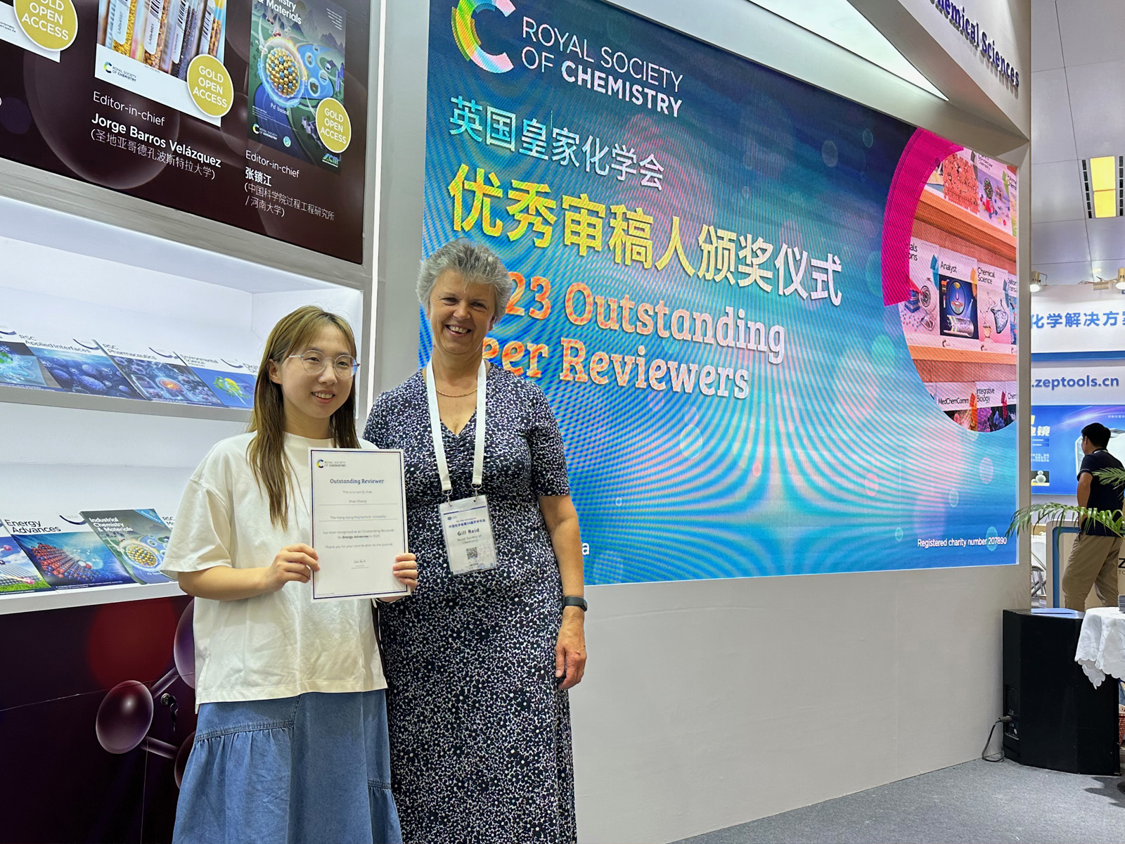 At our exhibition stand, Prof Reid presented certificates to 47 outstanding peer reviewers based in China, including Dr Miao Zhang from Hong Kong Polytechnic University, pictured. Picture: © Royal Society of Chemistry