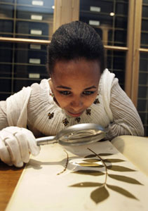 PhD chemist, Hareg Tadesse pictured viewing a remarkable 230-year-old preserved plant produced by the Linnaean Society after discussions with the Roya