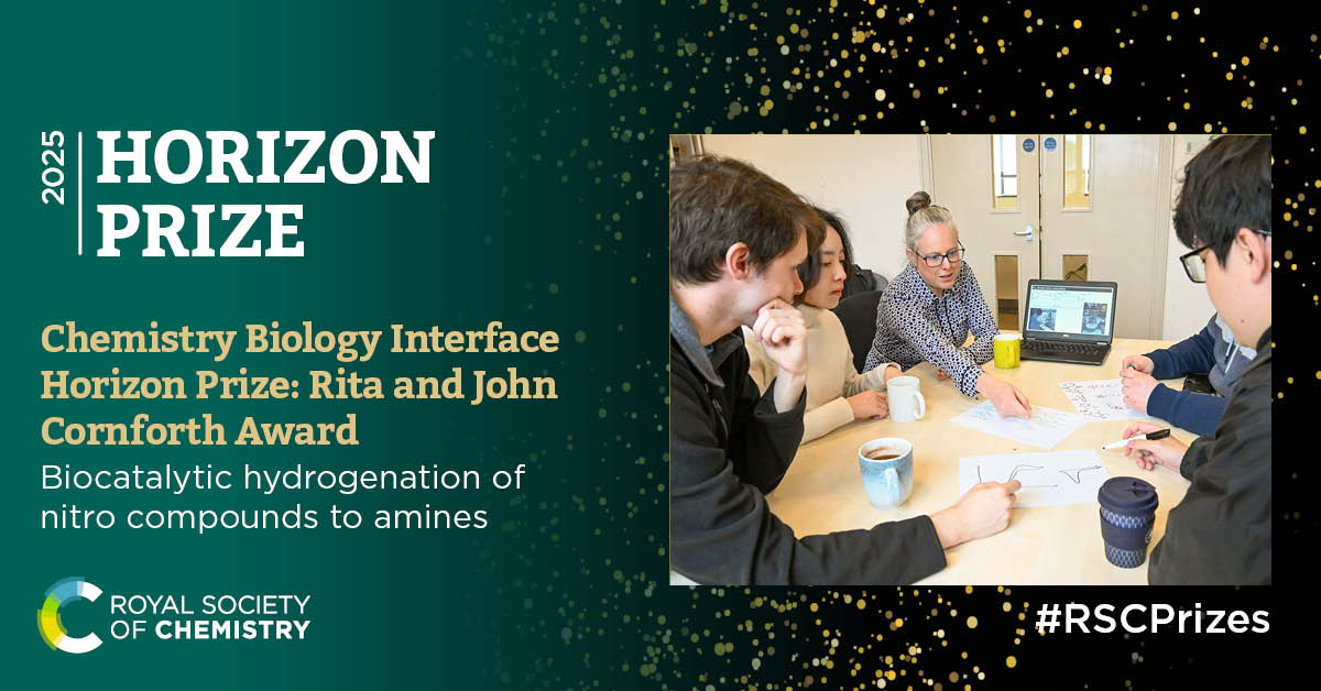 Download celebratory graphic2025 Chemistry Biology Interface Horizon Prize: awarded for the development of an industrially-applicable hydrogenase for mild and selective hydrogenation of nitro compounds to amines.